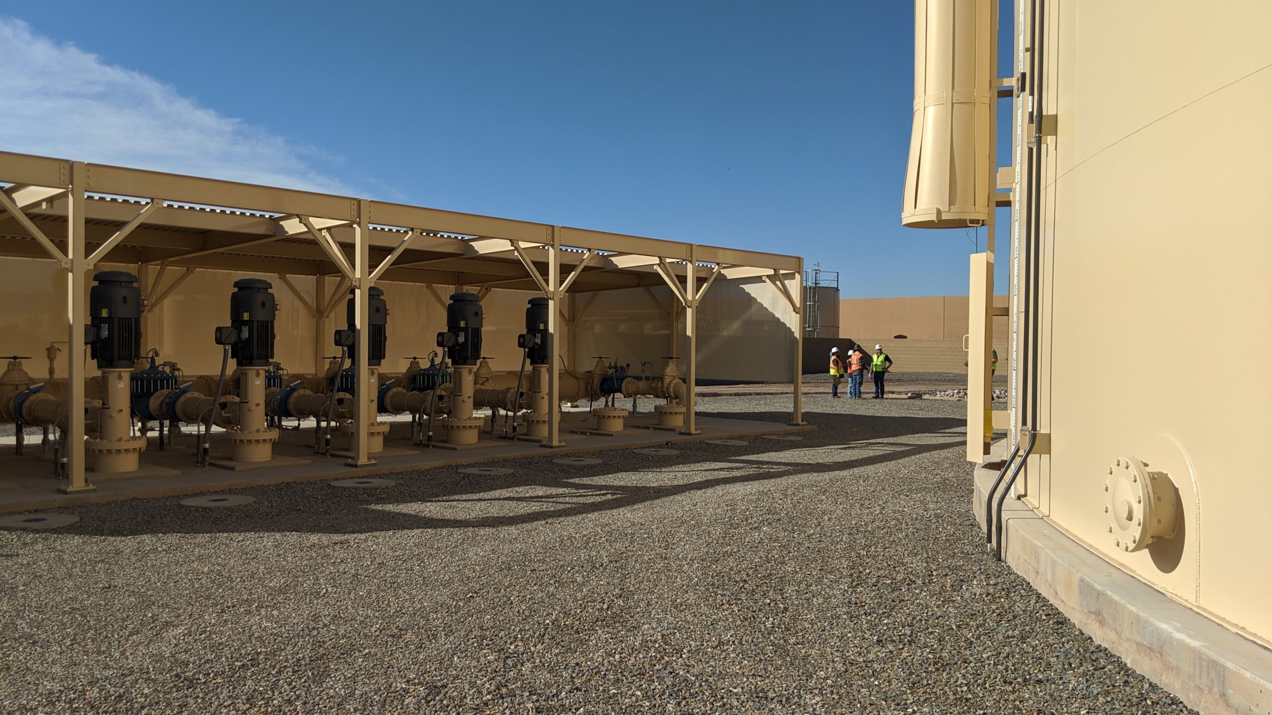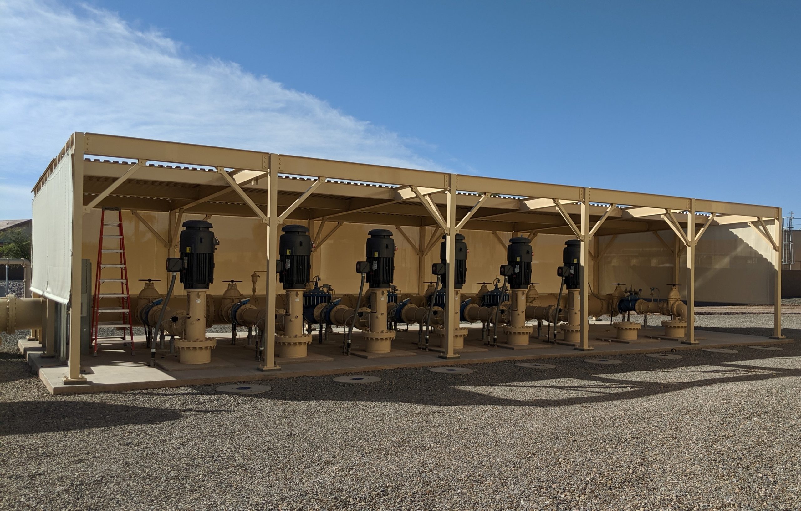 The site included an electrical building, a standby generator, an automatic transfer switch, and a remote terminal unit (RTU) with an operator interface for monitoring and control, allowing remote monitoring from the SCADA master located in Casa Grande. The existing Well 29 SCADA system was used in conjunction with a fiber optic cable to remotely monitor and control the new facility from the existing SCADA master. Pole-mounted area lights and lighting under mechanical equipment shade canopies were provided for security and task lighting.