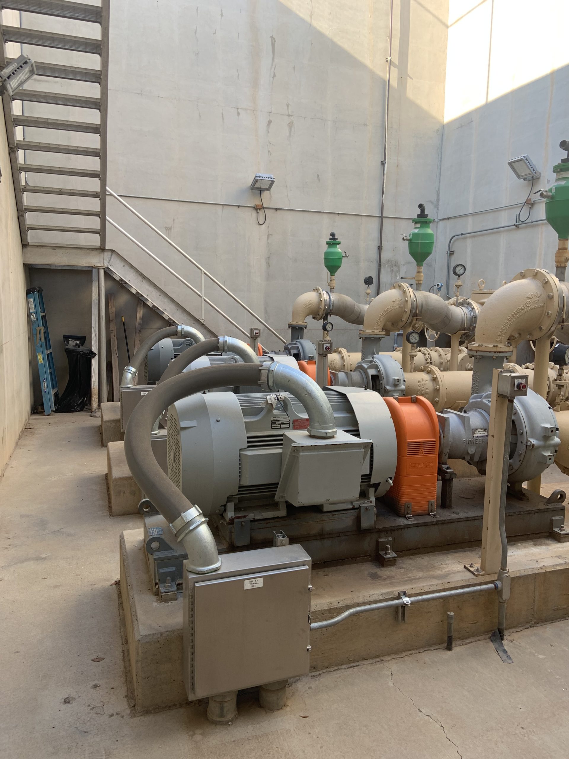 Two of the booster pumps were controlled by variable frequency drives (VFDs), while solid-state soft starters controlled four to maintain a constant discharge pressure. Sodium hypochlorite was used between the nitrate removal system and the storage reservoir to disinfect the treated well water supplied.